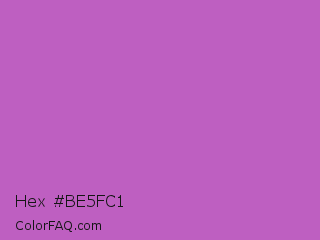 Hex #be5fc1 Color is a normal magenta color and the nearest color is Fuchsia Pink #c154c1. Hex code #be5fc1 and RGB value is rgb(190,95,193). In RGB color space, this color is composed of 75% red, 37% green, 76% blue, In CMYK color space, this color is composed of 2% cyan, 51% magenta, 0% yellow , 24% black , In HSL color space, this color has a hue angle of 298° , 44% saturation and 56% lightness.