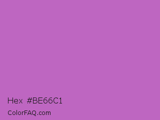 Hex #be66c1 Color is a normal magenta color and the nearest color is Fuchsia Pink #c154c1. Hex code #be66c1 and RGB value is rgb(190,102,193). In RGB color space, this color is composed of 75% red, 40% green, 76% blue, In CMYK color space, this color is composed of 2% cyan, 47% magenta, 0% yellow , 24% black , In HSL color space, this color has a hue angle of 298° , 42% saturation and 58% lightness.