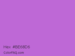 Hex #be68d6 Color is a light purple color and the nearest color is Rich Lilac #b666d2. Hex code #be68d6 and RGB value is rgb(190,104,214). In RGB color space, this color is composed of 75% red, 41% green, 84% blue, In CMYK color space, this color is composed of 11% cyan, 51% magenta, 0% yellow , 16% black , In HSL color space, this color has a hue angle of 287° , 57% saturation and 62% lightness.
