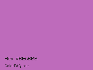 Hex #be6bbb Color is a normal magenta color and the nearest color is Sky Magenta #cf71af. Hex code #be6bbb and RGB value is rgb(190,107,187). In RGB color space, this color is composed of 75% red, 42% green, 73% blue, In CMYK color space, this color is composed of 0% cyan, 44% magenta, 2% yellow , 25% black , In HSL color space, this color has a hue angle of 302° , 39% saturation and 58% lightness.