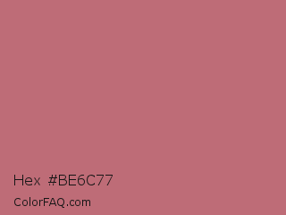 Hex #be6c77 Color is a normal red color and the nearest color is Rose Gold #b76e79. Hex code #be6c77 and RGB value is rgb(190,108,119). In RGB color space, this color is composed of 75% red, 42% green, 47% blue, In CMYK color space, this color is composed of 0% cyan, 43% magenta, 37% yellow , 25% black , In HSL color space, this color has a hue angle of 352° , 39% saturation and 58% lightness.