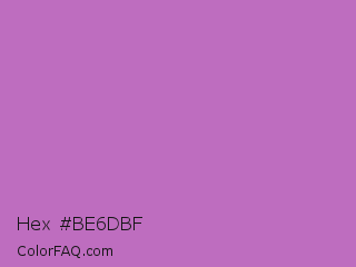 Hex #be6dbf Color is a normal magenta color and the nearest color is Rich Lilac #b666d2. Hex code #be6dbf and RGB value is rgb(190,109,191). In RGB color space, this color is composed of 75% red, 43% green, 75% blue, In CMYK color space, this color is composed of 1% cyan, 43% magenta, 0% yellow , 25% black , In HSL color space, this color has a hue angle of 299° , 39% saturation and 59% lightness.