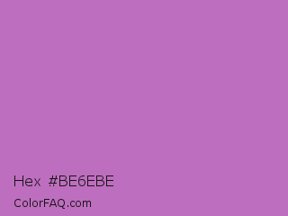 Hex #be6ebe Color is a normal magenta color and the nearest color is Sky Magenta #cf71af. Hex code #be6ebe and RGB value is rgb(190,110,190). In RGB color space, this color is composed of 75% red, 43% green, 75% blue, In CMYK color space, this color is composed of 0% cyan, 42% magenta, 0% yellow , 25% black , In HSL color space, this color has a hue angle of 300° , 38% saturation and 59% lightness.