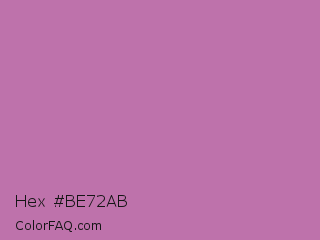 Hex #be72ab Color is a normal magenta color and the nearest color is Pearly Purple #b768a2. Hex code #be72ab and RGB value is rgb(190,114,171). In RGB color space, this color is composed of 75% red, 45% green, 67% blue, In CMYK color space, this color is composed of 0% cyan, 40% magenta, 10% yellow , 25% black , In HSL color space, this color has a hue angle of 315° , 37% saturation and 60% lightness.