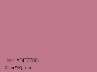 Hex #be778d Color is a light rose color and the nearest color is Old Rose #c08081. Hex code #be778d and RGB value is rgb(190,119,141). In RGB color space, this color is composed of 75% red, 47% green, 55% blue, In CMYK color space, this color is composed of 0% cyan, 37% magenta, 26% yellow , 25% black , In HSL color space, this color has a hue angle of 341° , 35% saturation and 61% lightness.