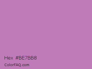 Hex #be7bb8 Color is a light magenta color and the nearest color is African Violet #b284be. Hex code #be7bb8 and RGB value is rgb(190,123,184). In RGB color space, this color is composed of 75% red, 48% green, 72% blue, In CMYK color space, this color is composed of 0% cyan, 35% magenta, 3% yellow , 25% black , In HSL color space, this color has a hue angle of 305° , 34% saturation and 61% lightness.
