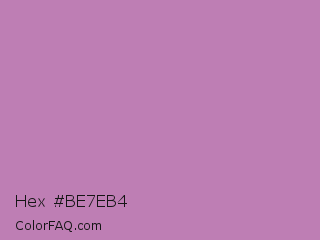 Hex #be7eb4 Color is a light magenta color and the nearest color is Opera Mauve #b784a7. Hex code #be7eb4 and RGB value is rgb(190,126,180). In RGB color space, this color is composed of 75% red, 49% green, 71% blue, In CMYK color space, this color is composed of 0% cyan, 34% magenta, 5% yellow , 25% black , In HSL color space, this color has a hue angle of 309° , 33% saturation and 62% lightness.