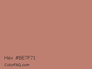 Hex #be7f71 Color is a normal red color and the nearest color is Old Rose #c08081. Hex code #be7f71 and RGB value is rgb(190,127,113). In RGB color space, this color is composed of 75% red, 50% green, 44% blue, In CMYK color space, this color is composed of 0% cyan, 33% magenta, 41% yellow , 25% black , In HSL color space, this color has a hue angle of 11° , 37% saturation and 59% lightness.
