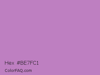 Hex #be7fc1 Color is a light magenta color and the nearest color is African Violet #b284be. Hex code #be7fc1 and RGB value is rgb(190,127,193). In RGB color space, this color is composed of 75% red, 50% green, 76% blue, In CMYK color space, this color is composed of 2% cyan, 34% magenta, 0% yellow , 24% black , In HSL color space, this color has a hue angle of 297° , 35% saturation and 63% lightness.