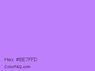 Hex #be7ffd Color is a light violet color and the nearest color is Pale Violet #cc99ff. Hex code #be7ffd and RGB value is rgb(190,127,253). In RGB color space, this color is composed of 75% red, 50% green, 99% blue, In CMYK color space, this color is composed of 25% cyan, 50% magenta, 0% yellow , 1% black , In HSL color space, this color has a hue angle of 270° , 97% saturation and 75% lightness.