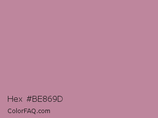 Hex #be869d Color is a light rose color and the nearest color is Opera Mauve #b784a7. Hex code #be869d and RGB value is rgb(190,134,157). In RGB color space, this color is composed of 75% red, 53% green, 62% blue, In CMYK color space, this color is composed of 0% cyan, 29% magenta, 17% yellow , 25% black , In HSL color space, this color has a hue angle of 335° , 30% saturation and 64% lightness.