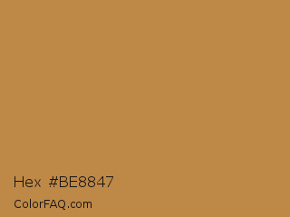 Hex #be8847 Color is a normal orange color and the nearest color is Peru #cd853f. Hex code #be8847 and RGB value is rgb(190,136,71). In RGB color space, this color is composed of 75% red, 53% green, 28% blue, In CMYK color space, this color is composed of 0% cyan, 28% magenta, 63% yellow , 25% black , In HSL color space, this color has a hue angle of 33° , 48% saturation and 51% lightness.