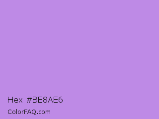 Hex #be8ae6 Color is a light purple color and the nearest color is Bright Lavender #bf94e4. Hex code #be8ae6 and RGB value is rgb(190,138,230). In RGB color space, this color is composed of 75% red, 54% green, 90% blue, In CMYK color space, this color is composed of 17% cyan, 40% magenta, 0% yellow , 10% black , In HSL color space, this color has a hue angle of 274° , 65% saturation and 72% lightness.