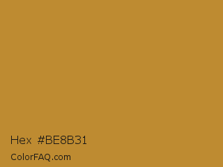 Hex #be8b31 Color is a normal orange color and the nearest color is Marigold #b98d28. Hex code #be8b31 and RGB value is rgb(190,139,49). In RGB color space, this color is composed of 75% red, 55% green, 19% blue, In CMYK color space, this color is composed of 0% cyan, 27% magenta, 74% yellow , 25% black , In HSL color space, this color has a hue angle of 38° , 59% saturation and 47% lightness.