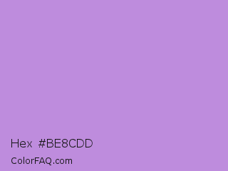 Hex #be8cdd Color is a light purple color and the nearest color is Bright Lavender #bf94e4. Hex code #be8cdd and RGB value is rgb(190,140,221). In RGB color space, this color is composed of 75% red, 55% green, 87% blue, In CMYK color space, this color is composed of 14% cyan, 37% magenta, 0% yellow , 13% black , In HSL color space, this color has a hue angle of 277° , 54% saturation and 71% lightness.