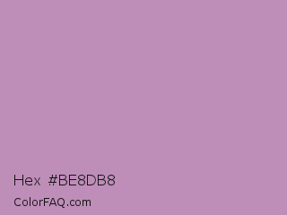 Hex #be8db8 Color is a light magenta color and the nearest color is African Violet #b284be. Hex code #be8db8 and RGB value is rgb(190,141,184). In RGB color space, this color is composed of 75% red, 55% green, 72% blue, In CMYK color space, this color is composed of 0% cyan, 26% magenta, 3% yellow , 25% black , In HSL color space, this color has a hue angle of 307° , 27% saturation and 65% lightness.