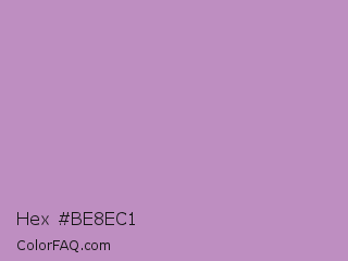 Hex #be8ec1 Color is a light magenta color and the nearest color is African Violet #b284be. Hex code #be8ec1 and RGB value is rgb(190,142,193). In RGB color space, this color is composed of 75% red, 56% green, 76% blue, In CMYK color space, this color is composed of 2% cyan, 26% magenta, 0% yellow , 24% black , In HSL color space, this color has a hue angle of 296° , 29% saturation and 66% lightness.