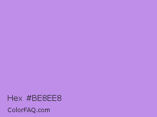 Hex #be8ee8 Color is a light purple color and the nearest color is Bright Lavender #bf94e4. Hex code #be8ee8 and RGB value is rgb(190,142,232). In RGB color space, this color is composed of 75% red, 56% green, 91% blue, In CMYK color space, this color is composed of 18% cyan, 39% magenta, 0% yellow , 9% black , In HSL color space, this color has a hue angle of 272° , 66% saturation and 73% lightness.