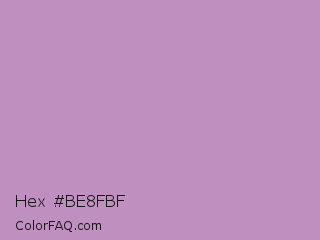 Hex #be8fbf Color is a light magenta color and the nearest color is African Violet #b284be. Hex code #be8fbf and RGB value is rgb(190,143,191). In RGB color space, this color is composed of 75% red, 56% green, 75% blue, In CMYK color space, this color is composed of 1% cyan, 25% magenta, 0% yellow , 25% black , In HSL color space, this color has a hue angle of 299° , 27% saturation and 65% lightness.