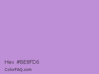 Hex #be8fd6 Color is a light purple color and the nearest color is Bright Lavender #bf94e4. Hex code #be8fd6 and RGB value is rgb(190,143,214). In RGB color space, this color is composed of 75% red, 56% green, 84% blue, In CMYK color space, this color is composed of 11% cyan, 33% magenta, 0% yellow , 16% black , In HSL color space, this color has a hue angle of 280° , 46% saturation and 70% lightness.