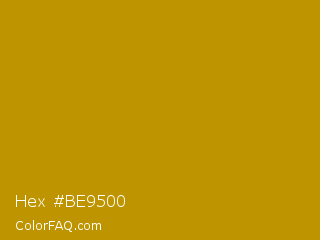 Hex #be9500 Color is a normal yellow color and the nearest color is Buddha Gold #c1a004. Hex code #be9500 and RGB value is rgb(190,149,0). In RGB color space, this color is composed of 75% red, 58% green, 0% blue, In CMYK color space, this color is composed of 0% cyan, 22% magenta, 100% yellow , 25% black , In HSL color space, this color has a hue angle of 47° , 100% saturation and 37% lightness.