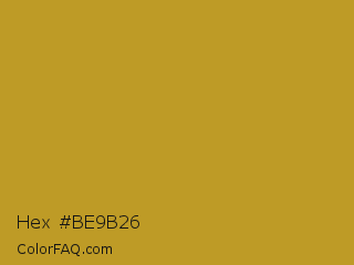 Hex #be9b26 Color is a normal yellow color and the nearest color is Nugget #c59922. Hex code #be9b26 and RGB value is rgb(190,155,38). In RGB color space, this color is composed of 75% red, 61% green, 15% blue, In CMYK color space, this color is composed of 0% cyan, 18% magenta, 80% yellow , 25% black , In HSL color space, this color has a hue angle of 46° , 67% saturation and 45% lightness.