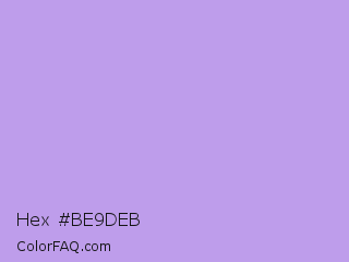 Hex #be9deb Color is a light violet color and the nearest color is Bright Lavender #bf94e4. Hex code #be9deb and RGB value is rgb(190,157,235). In RGB color space, this color is composed of 75% red, 62% green, 92% blue, In CMYK color space, this color is composed of 19% cyan, 33% magenta, 0% yellow , 8% black , In HSL color space, this color has a hue angle of 265° , 66% saturation and 77% lightness.