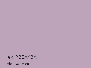 Hex #bea4ba Color is a light magenta color and the nearest color is London Hue #bea6c3. Hex code #bea4ba and RGB value is rgb(190,164,186). In RGB color space, this color is composed of 75% red, 64% green, 73% blue, In CMYK color space, this color is composed of 0% cyan, 14% magenta, 2% yellow , 25% black , In HSL color space, this color has a hue angle of 309° , 17% saturation and 69% lightness.