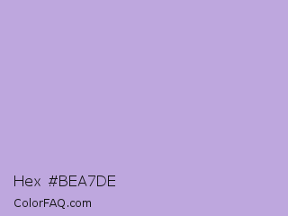 Hex #bea7de Color is a light violet color and the nearest color is Light Wisteria #c9a0dc. Hex code #bea7de and RGB value is rgb(190,167,222). In RGB color space, this color is composed of 75% red, 65% green, 87% blue, In CMYK color space, this color is composed of 14% cyan, 25% magenta, 0% yellow , 13% black , In HSL color space, this color has a hue angle of 265° , 45% saturation and 76% lightness.