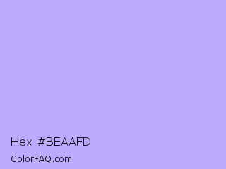 Hex #beaafd Color is a very light indigo color and the nearest color is Pale Violet #cc99ff. Hex code #beaafd and RGB value is rgb(190,170,253). In RGB color space, this color is composed of 75% red, 67% green, 99% blue, In CMYK color space, this color is composed of 25% cyan, 33% magenta, 0% yellow , 1% black , In HSL color space, this color has a hue angle of 254° , 95% saturation and 83% lightness.