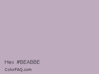 Hex #beabbe Color is a light magenta color and the nearest color is London Hue #bea6c3. Hex code #beabbe and RGB value is rgb(190,171,190). In RGB color space, this color is composed of 75% red, 67% green, 75% blue, In CMYK color space, this color is composed of 0% cyan, 10% magenta, 0% yellow , 25% black , In HSL color space, this color has a hue angle of 300° , 13% saturation and 71% lightness.