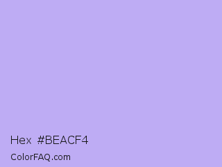 Hex #beacf4 Color is a very light indigo color and the nearest color is Biloba Flower #b2a1ea. Hex code #beacf4 and RGB value is rgb(190,172,244). In RGB color space, this color is composed of 75% red, 67% green, 96% blue, In CMYK color space, this color is composed of 22% cyan, 30% magenta, 0% yellow , 4% black , In HSL color space, this color has a hue angle of 255° , 77% saturation and 82% lightness.