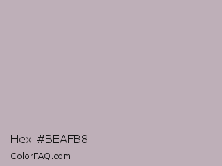 Hex #beafb8 Color is a light magenta color and the nearest color is Black Shadows #bfafb2. Hex code #beafb8 and RGB value is rgb(190,175,184). In RGB color space, this color is composed of 75% red, 69% green, 72% blue, In CMYK color space, this color is composed of 0% cyan, 8% magenta, 3% yellow , 25% black , In HSL color space, this color has a hue angle of 324° , 10% saturation and 72% lightness.
