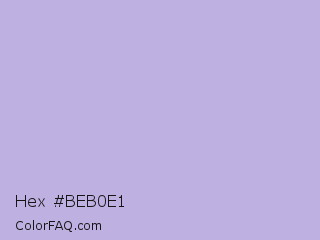 Hex #beb0e1 Color is a light indigo color and the nearest color is Lavender Gray #bdbbd7. Hex code #beb0e1 and RGB value is rgb(190,176,225). In RGB color space, this color is composed of 75% red, 69% green, 88% blue, In CMYK color space, this color is composed of 16% cyan, 22% magenta, 0% yellow , 12% black , In HSL color space, this color has a hue angle of 257° , 45% saturation and 79% lightness.