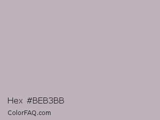 Hex #beb3bb Color is a light magenta color and the nearest color is Pink Swan #beb5b7. Hex code #beb3bb and RGB value is rgb(190,179,187). In RGB color space, this color is composed of 75% red, 70% green, 73% blue, In CMYK color space, this color is composed of 0% cyan, 6% magenta, 2% yellow , 25% black , In HSL color space, this color has a hue angle of 316° , 8% saturation and 72% lightness.