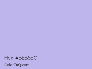 Hex #beb5ec Color is a very light indigo color and the nearest color is Maximum Blue Purple #acace6. Hex code #beb5ec and RGB value is rgb(190,181,236). In RGB color space, this color is composed of 75% red, 71% green, 93% blue, In CMYK color space, this color is composed of 19% cyan, 23% magenta, 0% yellow , 7% black , In HSL color space, this color has a hue angle of 250° , 59% saturation and 82% lightness.
