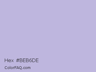 Hex #beb6de Color is a light indigo color and the nearest color is Lavender Gray #bdbbd7. Hex code #beb6de and RGB value is rgb(190,182,222). In RGB color space, this color is composed of 75% red, 71% green, 87% blue, In CMYK color space, this color is composed of 14% cyan, 18% magenta, 0% yellow , 13% black , In HSL color space, this color has a hue angle of 252° , 38% saturation and 79% lightness.