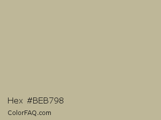Hex #beb798 Color is a light yellow color and the nearest color is Malta #bdb2a1. Hex code #beb798 and RGB value is rgb(190,183,152). In RGB color space, this color is composed of 75% red, 72% green, 60% blue, In CMYK color space, this color is composed of 0% cyan, 4% magenta, 20% yellow , 25% black , In HSL color space, this color has a hue angle of 49° , 23% saturation and 67% lightness.