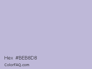 Hex #beb8d8 Color is a light indigo color and the nearest color is Lavender Gray #bdbbd7. Hex code #beb8d8 and RGB value is rgb(190,184,216). In RGB color space, this color is composed of 75% red, 72% green, 85% blue, In CMYK color space, this color is composed of 12% cyan, 15% magenta, 0% yellow , 15% black , In HSL color space, this color has a hue angle of 251° , 29% saturation and 78% lightness.