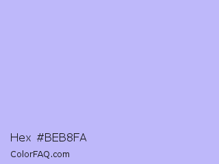 Hex #beb8fa Color is a very light indigo color and the nearest color is Melrose #c7c1ff. Hex code #beb8fa and RGB value is rgb(190,184,250). In RGB color space, this color is composed of 75% red, 72% green, 98% blue, In CMYK color space, this color is composed of 24% cyan, 26% magenta, 0% yellow , 2% black , In HSL color space, this color has a hue angle of 245° , 87% saturation and 85% lightness.
