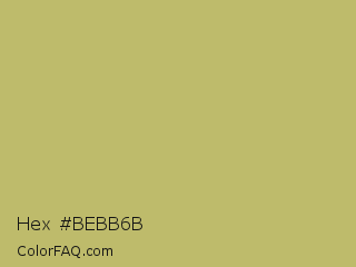 Hex #bebb6b Color is a normal yellow color and the nearest color is Dark Khaki #bdb76b. Hex code #bebb6b and RGB value is rgb(190,187,107). In RGB color space, this color is composed of 75% red, 73% green, 42% blue, In CMYK color space, this color is composed of 0% cyan, 2% magenta, 44% yellow , 25% black , In HSL color space, this color has a hue angle of 58° , 39% saturation and 58% lightness.