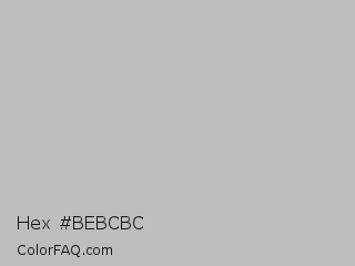 Hex #bebcbc Color is a light red color and the nearest color is Gray X11 Gray #bebebe. Hex code #bebcbc and RGB value is rgb(190,188,188). In RGB color space, this color is composed of 75% red, 74% green, 74% blue, In CMYK color space, this color is composed of 0% cyan, 1% magenta, 1% yellow , 25% black , In HSL color space, this color has a hue angle of 0° , 2% saturation and 74% lightness.