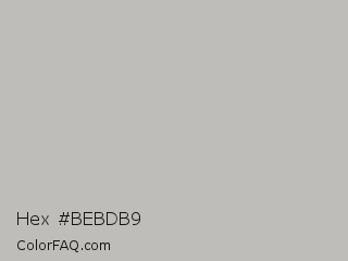 Hex #bebdb9 Color is a light yellow color and the nearest color is Cotton Seed #c2bdb6. Hex code #bebdb9 and RGB value is rgb(190,189,185). In RGB color space, this color is composed of 75% red, 74% green, 73% blue, In CMYK color space, this color is composed of 0% cyan, 1% magenta, 3% yellow , 25% black , In HSL color space, this color has a hue angle of 48° , 4% saturation and 74% lightness.
