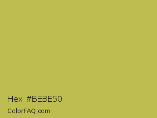 Hex #bebe50 Color is a normal yellow color and the nearest color is Turmeric #cabb48. Hex code #bebe50 and RGB value is rgb(190,190,80). In RGB color space, this color is composed of 75% red, 75% green, 31% blue, In CMYK color space, this color is composed of 0% cyan, 0% magenta, 58% yellow , 25% black , In HSL color space, this color has a hue angle of 60° , 46% saturation and 53% lightness.