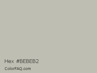 Hex #bebeb2 Color is a light yellow color and the nearest color is Tea #c1bab0. Hex code #bebeb2 and RGB value is rgb(190,190,178). In RGB color space, this color is composed of 75% red, 75% green, 70% blue, In CMYK color space, this color is composed of 0% cyan, 0% magenta, 6% yellow , 25% black , In HSL color space, this color has a hue angle of 60° , 8% saturation and 72% lightness.