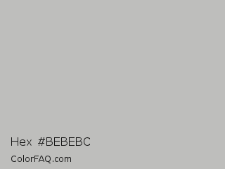 Hex #bebebc Color is a light yellow color and the nearest color is Gray X11 Gray #bebebe. Hex code #bebebc and RGB value is rgb(190,190,188). In RGB color space, this color is composed of 75% red, 75% green, 74% blue, In CMYK color space, this color is composed of 0% cyan, 0% magenta, 1% yellow , 25% black , In HSL color space, this color has a hue angle of 60° , 2% saturation and 74% lightness.