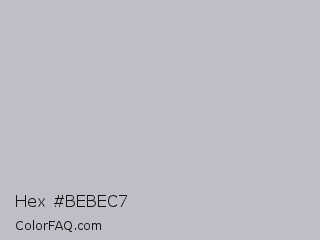 Hex #bebec7 Color is a light blue color and the nearest color is French Gray #bdbdc6. Hex code #bebec7 and RGB value is rgb(190,190,199). In RGB color space, this color is composed of 75% red, 75% green, 78% blue, In CMYK color space, this color is composed of 5% cyan, 5% magenta, 0% yellow , 22% black , In HSL color space, this color has a hue angle of 240° , 7% saturation and 76% lightness.