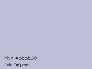 Hex #bebed6 Color is a light blue color and the nearest color is Blue Haze #bfbed8. Hex code #bebed6 and RGB value is rgb(190,190,214). In RGB color space, this color is composed of 75% red, 75% green, 84% blue, In CMYK color space, this color is composed of 11% cyan, 11% magenta, 0% yellow , 16% black , In HSL color space, this color has a hue angle of 240° , 23% saturation and 79% lightness.