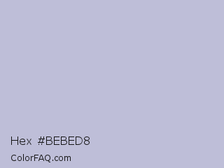 Hex #bebed8 Color is a light blue color and the nearest color is Blue Haze #bfbed8. Hex code #bebed8 and RGB value is rgb(190,190,216). In RGB color space, this color is composed of 75% red, 75% green, 85% blue, In CMYK color space, this color is composed of 12% cyan, 12% magenta, 0% yellow , 15% black , In HSL color space, this color has a hue angle of 240° , 25% saturation and 80% lightness.