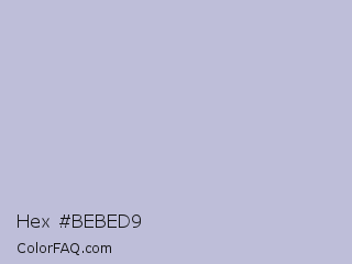 Hex #bebed9 Color is a light blue color and the nearest color is Blue Haze #bfbed8. Hex code #bebed9 and RGB value is rgb(190,190,217). In RGB color space, this color is composed of 75% red, 75% green, 85% blue, In CMYK color space, this color is composed of 12% cyan, 12% magenta, 0% yellow , 15% black , In HSL color space, this color has a hue angle of 240° , 26% saturation and 80% lightness.